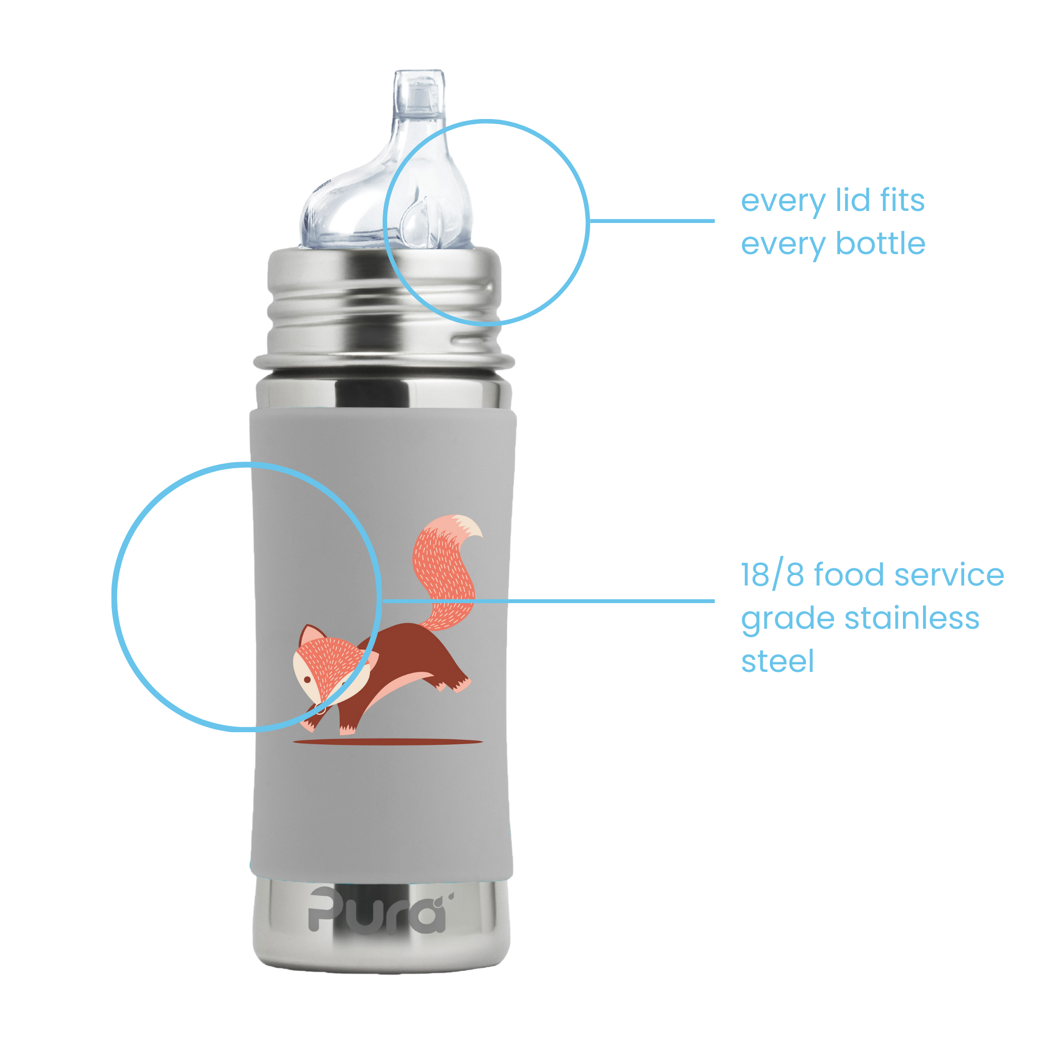 • Alle Pura silikonelåg passer til alle Pura-flasker - det er holdbare flasker, der "vokser" med barnet! Ved hjælp af et udskifteligt låg kan flasken nemt forvandles til en sut- eller sugerørflaske, en krukke til snacks eller en sportsflaske