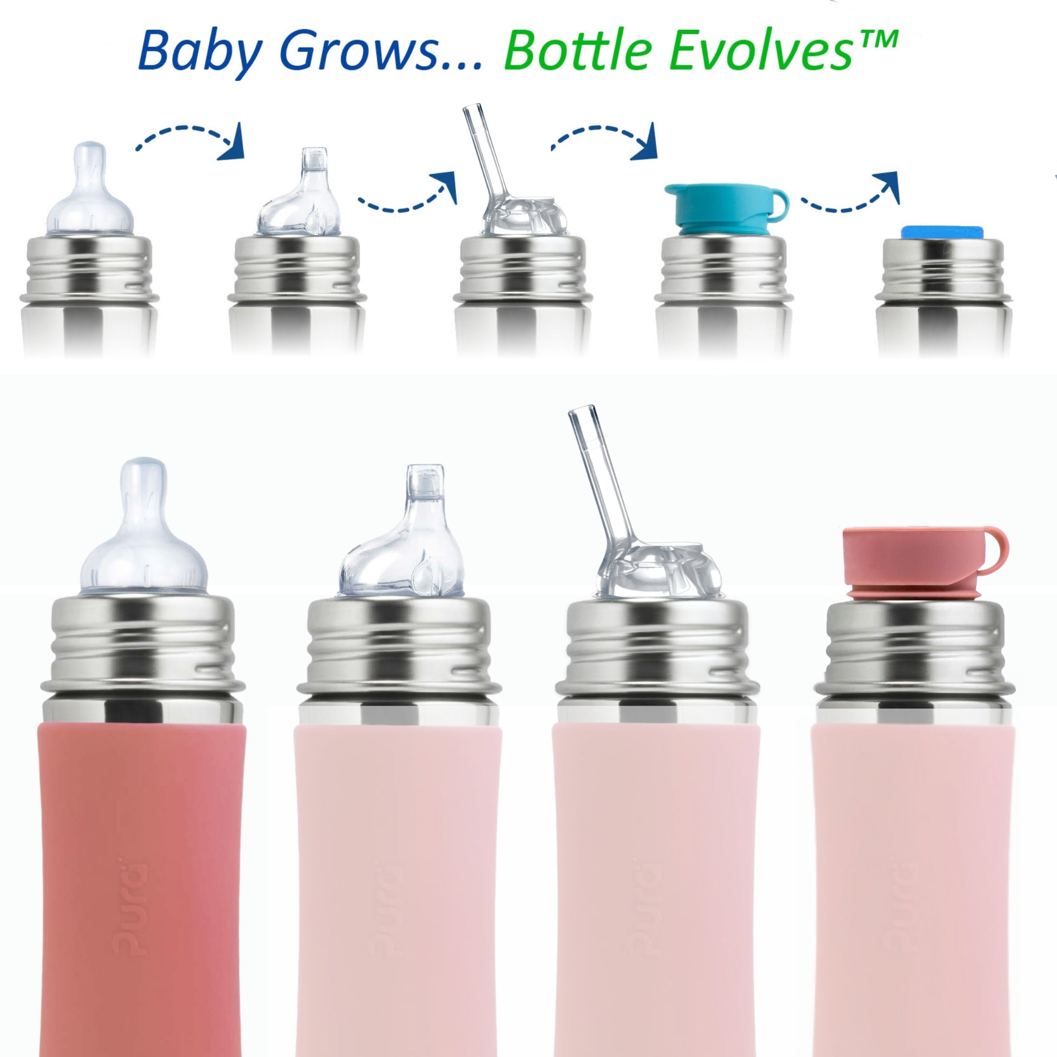 • Alla Pura silikonlock passar till alla Pura flaskor – det här är hållbara flaskor som ”växer” med barnet! Med hjälp av ett utbytbart lock kan flaskan enkelt förvandlas till en pip- eller sugrörflaska, en burk för snacks eller en sportflaska